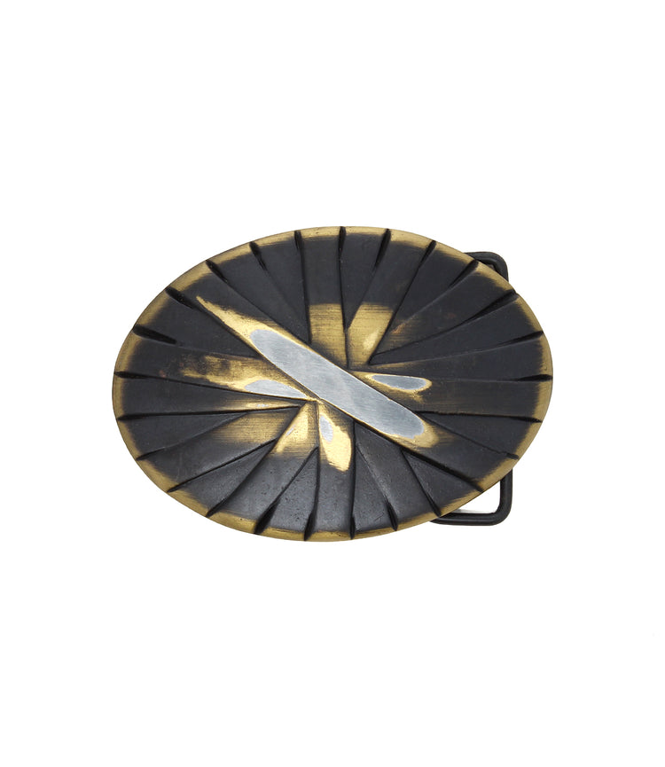 Some pieces invite a second look, and this buckle is one of them. The oval frame carries ridged lines that fan outward in a slow, steady rhythm, softened by an antiqued bronze tone that feels warm and lived-in. A brushed crossover detail interrupts the pattern just enough to add intrigue without noise. Simple, grounded, and intentionally unhurried, this bronze belt buckle brings subtle strength to those who appreciate thoughtful, textured design.