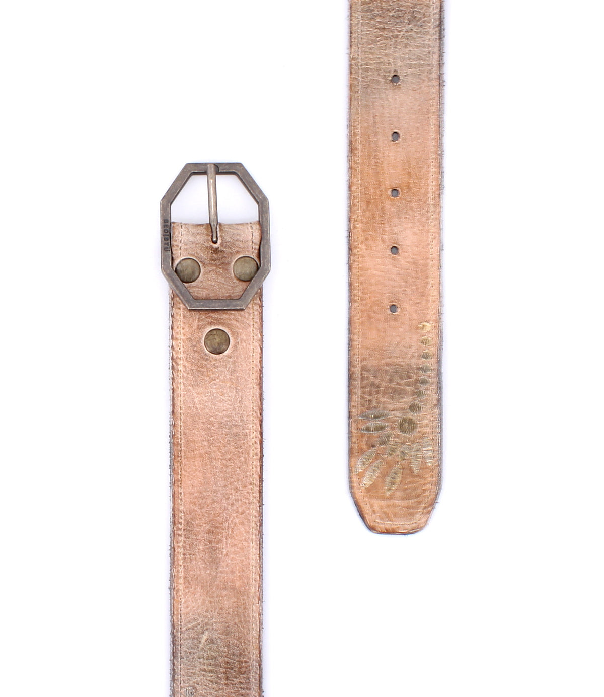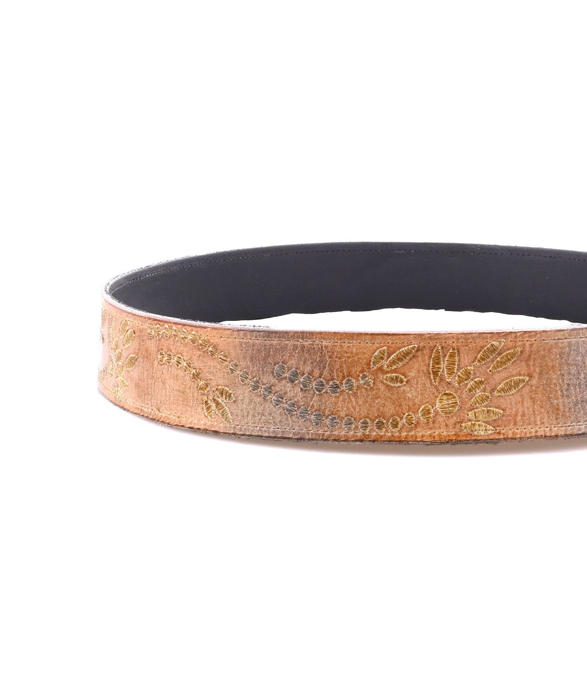 Mohawk is a women's distressed leather belt featuring intricately embroidered details with tonal stitching. The floral design will surely get noticed, along with the uniquely shaped metal buckle. Enjoy the Mohawk belt through belt loops or around your waist of your favorite maxi dress.