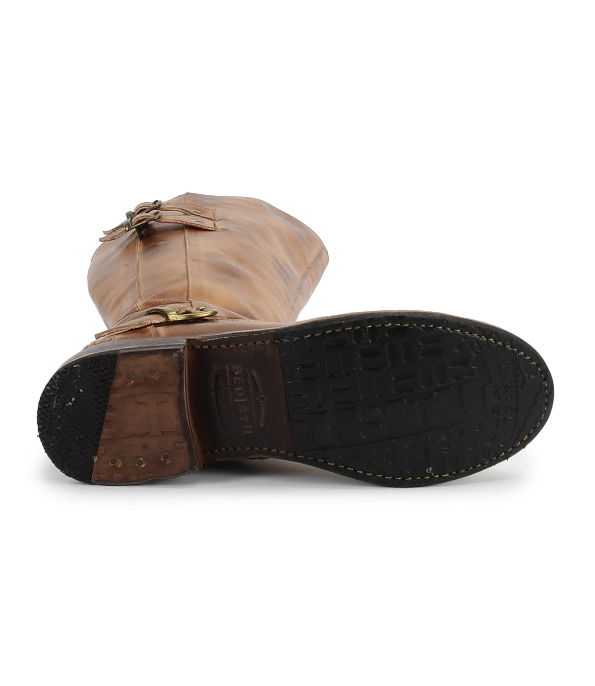 Timeless and tough with a refined edge, Essence is a knee-high riding boot crafted from hand-finished leather for a rich, worn-in feel. Triple brass buckles and a full-length zipper add utility and structure, while the asymmetrical shaft—slightly higher in front—nods to classic equestrian design and enhances comfort behind the knee. A rounded toe, low-stacked heel, and bold red leather interior complete the look. Grounded by a rubber-inlaid leather sole for grip and durability, this boot is built to move with confidence and character.