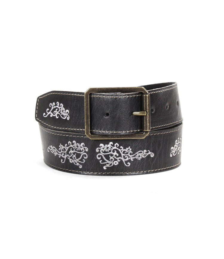 Blaze JB blends timeless craftsmanship with a touch of artistry. Handcrafted from rich, full-grain leather it carries the natural texture and character that only gets better with age. The antique-finished square buckle and dual metal rivets speak to durability, while the intricate white embroidered scrollwork adds a hint of bohemian elegance.