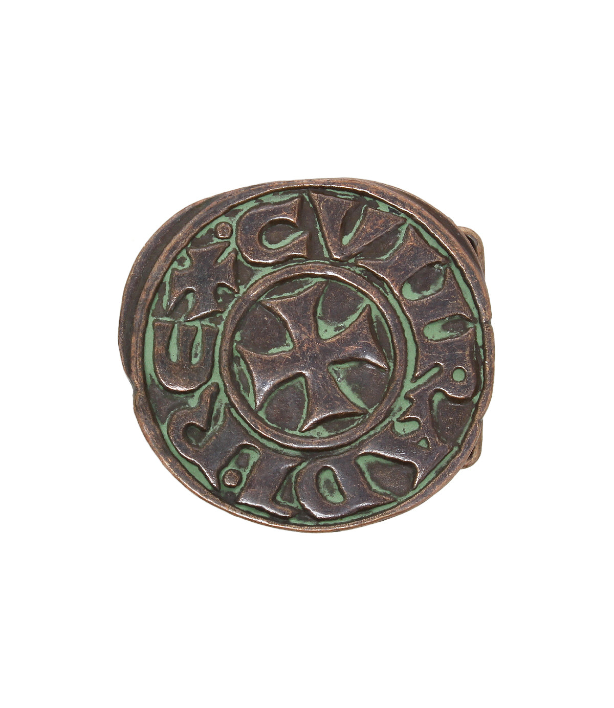 This belt buckle carries an old-world spirit with a bold, circular stance. The Greek cross rests at the center of an oxidized brown-green finish, giving the surface a layered, timeworn character that echoes historic belt buckle craftsmanship. Raised lettering and worn contours create a hand-touched feel that keeps the design grounded and authentic. For anyone drawn to pieces that feel discovered rather than made, this metal belt buckle lends an honest, time-worn charm to every outfit.