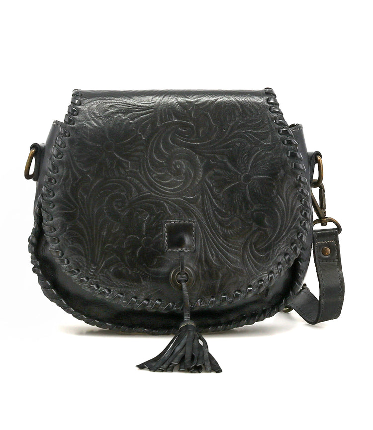 Half Moon is a saddlebag-shaped crossbody purse detailed with an embossed foliage pattern with accentuated whipstitch on edges and finished with a playful leather tassel. For closure, there is a metal clasp, while the interior features a zippered pocket and two slip pockets for easy organization. Complete with an adjustable strap, it's equal parts function and handcrafted charm.