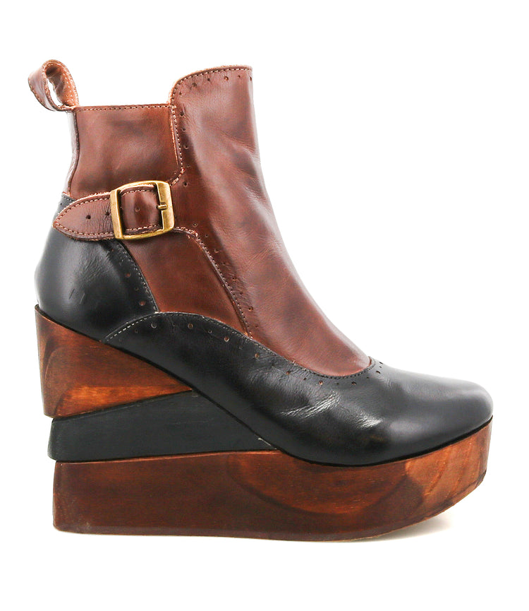 Harmonious is crafted to stand out, the Platform Wedge Ankle Boot is anything but ordinary. With a striking sculptural layered wood wedge, this style brings bold height and unexpected dimension. Decorative brogue-style perforations at the toe and heel offer a refined nod to tradition, while details like a brass buckle, side zipper with branded pull, and leather back tab add edge and ease. Finished with a rich red leather interior and a rubber grip sole for confident traction, this boot is made for making an entrance—not blending in.