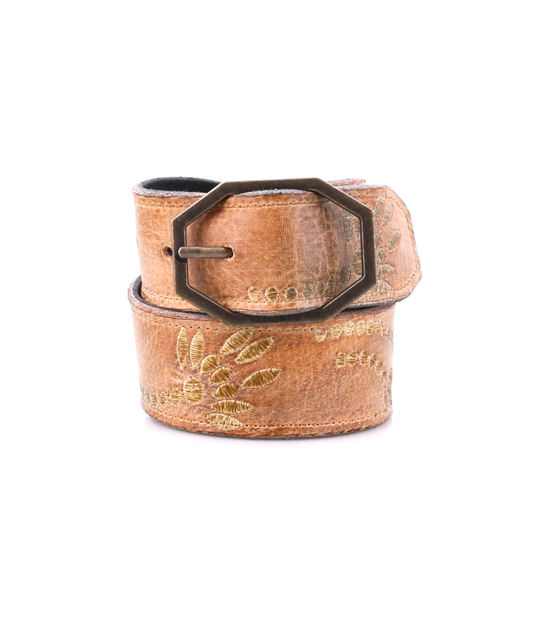 Mohawk is a women's distressed leather belt featuring intricately embroidered details with tonal stitching. The floral design will surely get noticed, along with the uniquely shaped metal buckle. Enjoy the Mohawk belt through belt loops or around your waist of your favorite maxi dress.