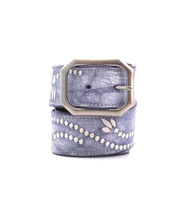 Mohawk is a women's distressed leather belt featuring intricately embroidered details with tonal stitching. The floral design will surely get noticed, along with the uniquely shaped metal buckle. Enjoy the Mohawk belt through belt loops or around your waist of your favorite maxi dress.