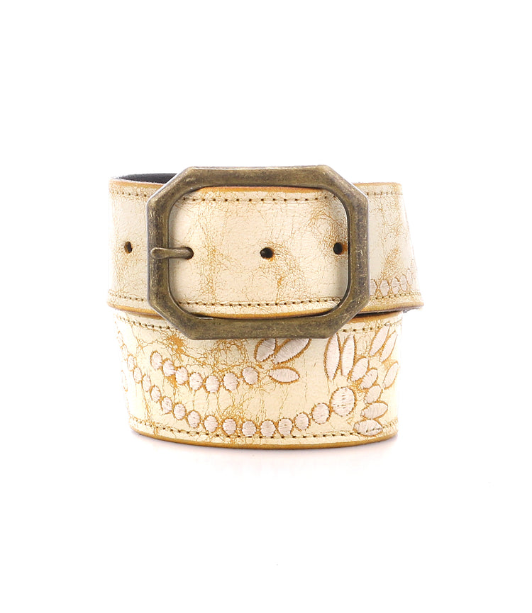 Mohawk is a women's distressed leather belt featuring intricately embroidered details with tonal stitching. The floral design will surely get noticed, along with the uniquely shaped metal buckle. Enjoy the Mohawk belt through belt loops or around your waist of your favorite maxi dress.